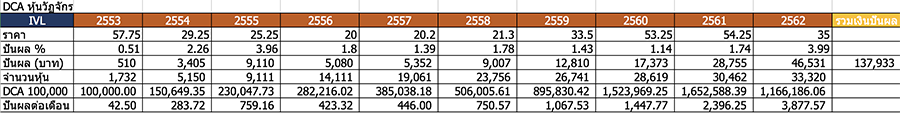 จากภาพจะเห็นว่า ถ้าเราซื้อหุ้น IVL ติดต่อกันมาเรื่อยๆ 9 ปี เริ่มตั้งแต่ปี 2553 - 2562 จะพบว่า ในปีสุดท้ายเราจะมีเงินในพอร์ตเริ่มต้นที่ 1 แสนบาท จะกลายเป็น 1.16 ล้านบาท! และในปีสุดท้ายเราจะได้เงินปันผลราว 4.65 หมื่นบาทต่อปี หรือเท่ากับได้เดือนละ 3.87 พันบาท แบบไม่ต้องทำงาน ซึ่งถือเป็น Passive Income