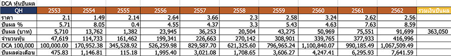 2) DCA กับหุ้นปันผล เช่น QH ... หลักการก็คือ ต้องเลือกหุ้นที่มีเงินปันผลสม่ำเสมอ มีความแน่นอน ไม่ใช่ปีนี้ปันผลเยอะ แต่ปีหน้ามีปันผลน้อย หรือไม่มีปันผลเลย
