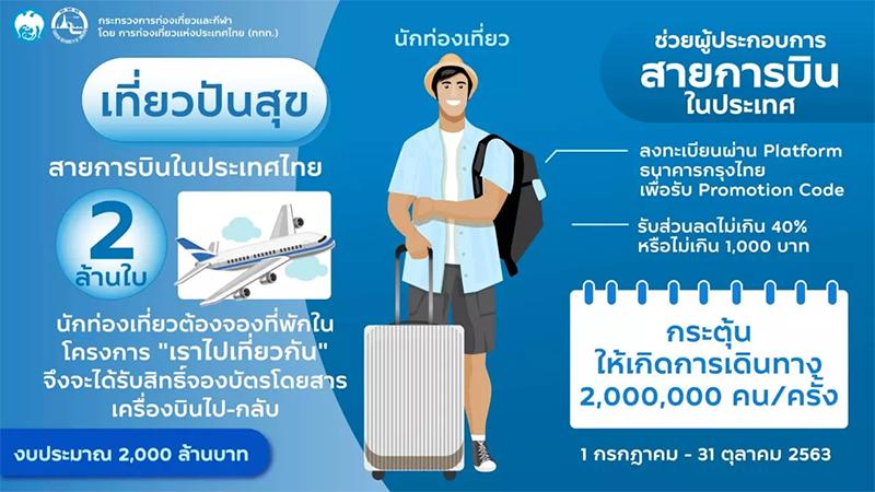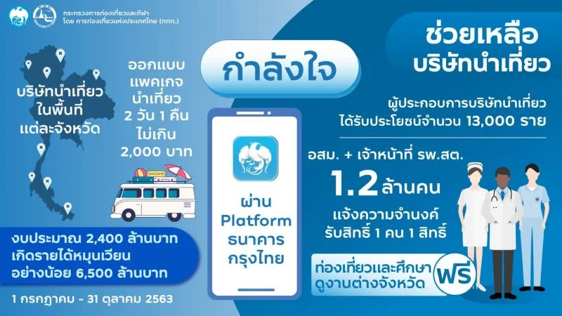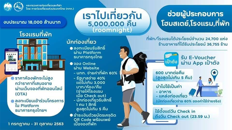จากที่รัฐบาลออกมาตรการฟื้นฟูเศรษฐกิจเเละสังคม ในการกระตุ้นการท่องเที่ยวภายในประเทศ โดยมีมติเห็นชอบเมื่อวันที่ 16 มิถุนายนที่ผ่านมา ด้วยเงินงบประมาณ 22,400 ล้านบาท แบ่งโครงการออกเป็น 3 รูปแบบ ได้เเก่ โครงการเที่ยวปันสุข, โครงการเราไปเที่ยวกัน และโครงการกำลังใจ เพื่อสร้างให้เกิดการหมุนเวียนเงินในอุตสาหกรรมการท่องเที่ยวภายในประเทศระยะเวลาจะอยู่ในช่วง 4 เดือน (1 ก.ค. - 31 ต.ค. 63) โดยจะเริ่มเปิดให้ลงทะเบียนได้ตั้งแต่วันที่ 1 กรกฎาคม 2563