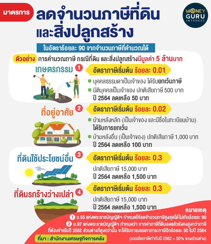 มาตรการลดภาษี ที่ดิน และสิ่งปลูกสร้าง มาตรการลดภาษีที่ดินฯ มีวัตถุประสงค์เพื่อบรรเทาผลกระทบด้านเศรษฐกิจและสังคมต่อประชาชน และผู้ประกอบการที่เป็นผู้เสียภาษีที่ดิน และสิ่งปลูกสร้าง เนื่องจากไม่สามารถประกอบกิจกรรมทางเศรษฐกิจได้ตามปกติ อันเนื่องมาจากผลกระทบจากการแพร่ระบาดของ COVID-19 โดยให้ลดภาษีในอัตราร้อยละ 90 ของจำนวนภาษีที่คำนวณได้สำหรับการจัดเก็บภาษีของปีภาษี พ.ศ. 2564