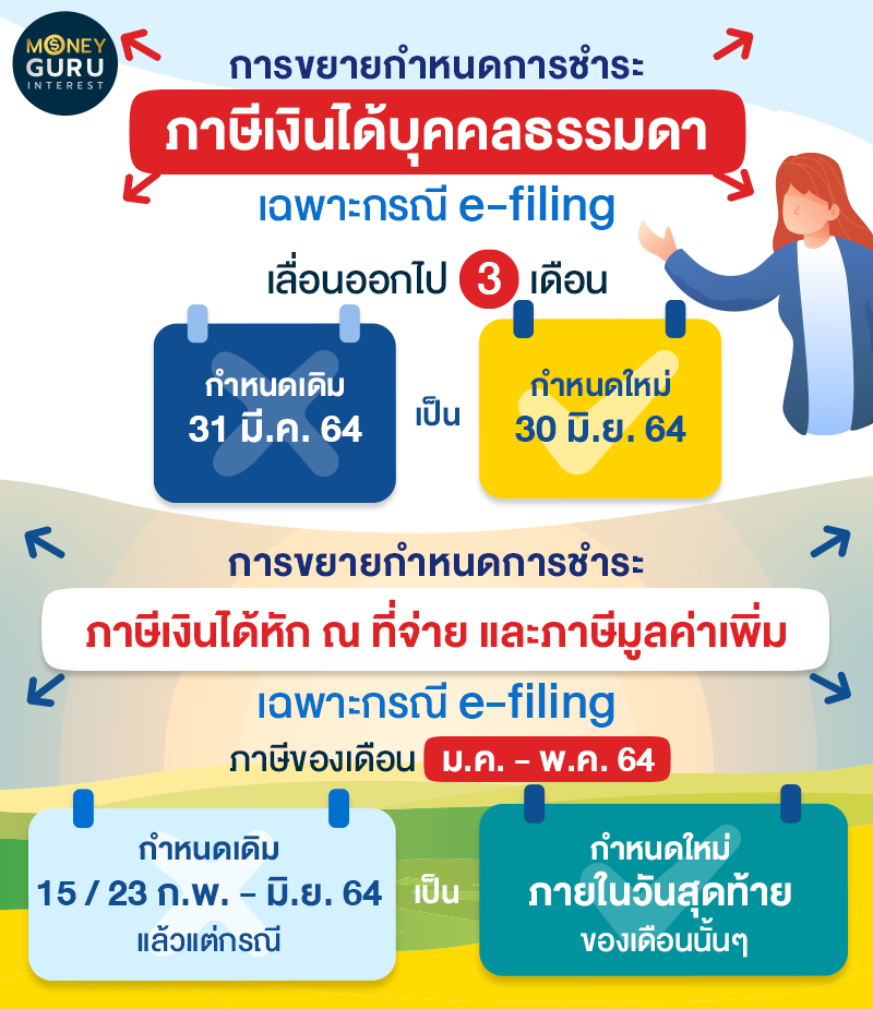 1. ขยายเวลาการยื่นและชำระภาษีเงินได้บุคคลธรรมดา 3 เดือน จากเดิมภายในวันที่ 31 มีนาคม 2564 เป็น 30 มิถุนายน 2564 เฉพาะการยื่นแบบ e-filing
