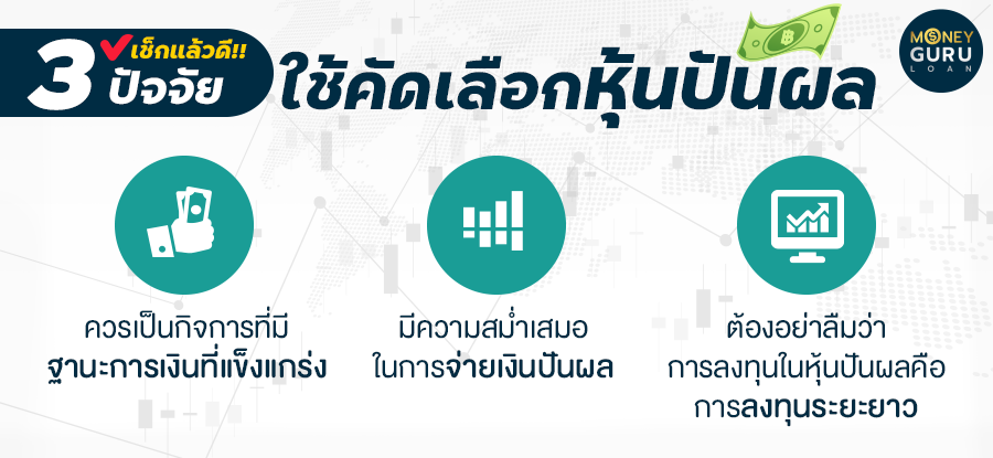 ปัจจัยที่ 3 >> ต้องอย่าลืมว่าการลงทุนในหุ้นปันผลคือการลงทุนระยะยาว เป็นการให้เงินทำงานแทนเรา นอกจากนี้เรามักจะพบว่าหลังจากที่บริษัทจ่ายเงินปันผลออกมา หุ้นจะมีราคาตกลงมาเท่ากับหรือมากกว่าเงินปันผลที่เราได้ (การจ่ายเงินปันผลให้ผู้ถือหุ้น คือการจ่ายเงินมาจากกำไรสุทธิ หรือกำไรสะสม ทำให้เงินสดในกิจการลดลง ส่งผลให้ราคาหุ้นอาจลดลงได้) ดังนั้นถ้าเราหวังแค่เงินปันผลระยะสั้น อยากซื้อหุ้นเพื่อรับเงินปันผลแล้วขายเลย อาจทำให้เราขาดทุนที่ราคาหุ้นแทน