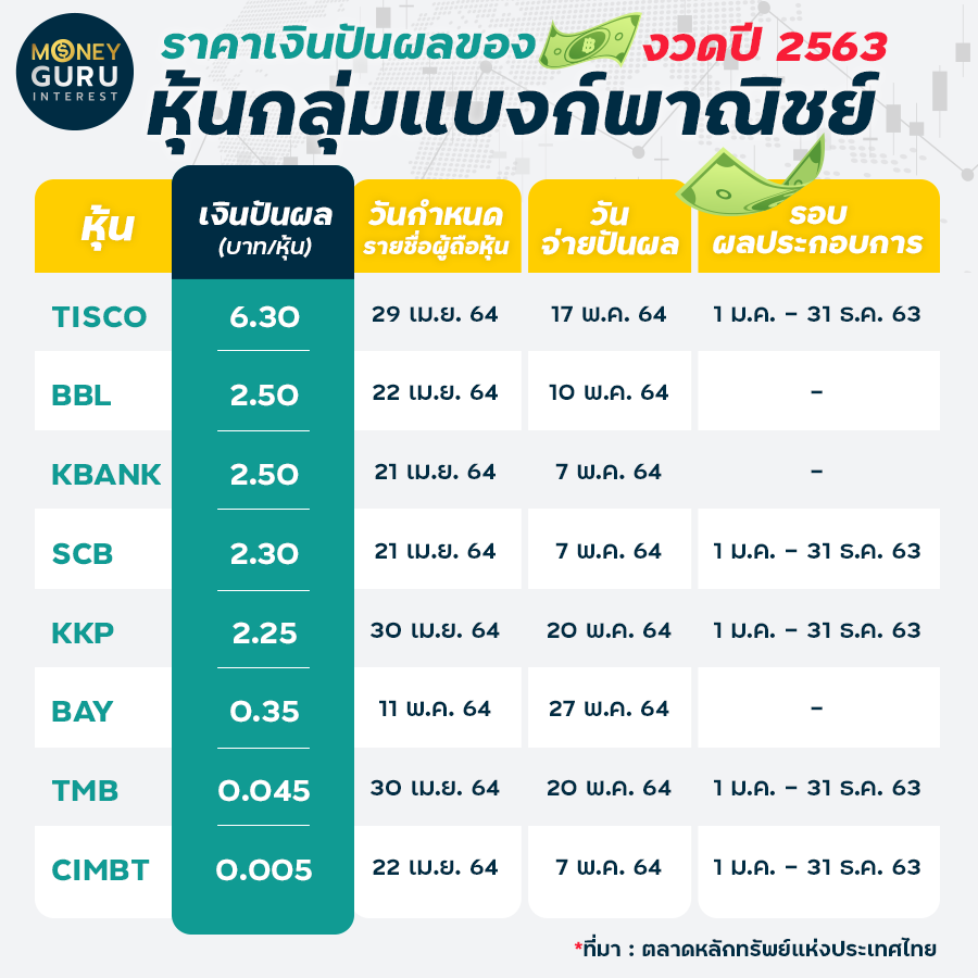 การจ่าย "เงินปันผล" ของหุ้นกลุ่มธนาคารพาณิชย์ งวดปี 2563? หลังจากที่ธนาคารแห่งประเทศไทย ได้ไฟเขียวให้สถาบันการเงินสามารถจ่ายเงินปันผลของงวดประจำปี 2563 โดยให้สถาบันการเงินสามารถจ่ายเงินปันผลจากผลการดำเนินงานของปี 2563 ได้ไม่เกินอัตราการจ่ายในปี 2562 และต้องไม่เกินร้อยละ 50 ของกำไรสุทธิของปี 2563 ซึ่งแบงก์ชาติได้ขอความร่วมมือให้สถาบันการเงินงดจ่ายปันผลเฉพาะกาล รวมถึงซื้อหุ้นคืน เนื่องจากความไม่แน่นอนของเศรษฐกิจไทยที่กำลังได้รับผลกระทบจากโควิด-19