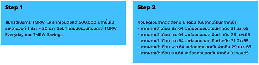 ข้อกำหนดและเงื่อนไข - เปิดบัญชี เงินฝากTMRW ระหว่างวันที่ 1 ส.ค.64 - 30 ธ.ค.64 โดยมียอดเงินฝากในบัญชี TMRW Everyday และ TMRW Savings (City of TMRW) รวมกันตั้งแต่ 500,000 บาทขึ้นไป ติดต่อกัน 6 เดือน (นับจากเดือนที่ฝากเข้า)