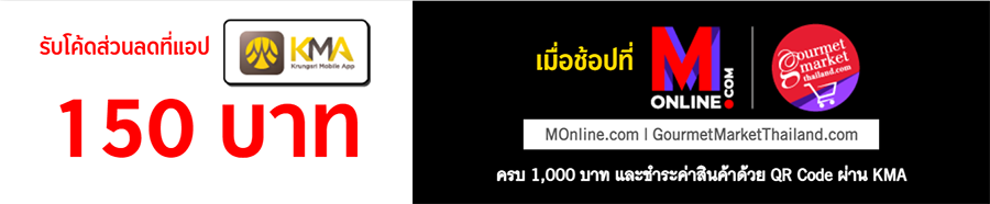 - ลูกค้าสามารถใช้โค้ดส่วนลด 150 บาท เมื่อซื้อสินค้าครบ 1,000 บาท ขึ้นไป (หลังหักส่วนลด) ผ่าน www.MOnline.com และ www.GourmetMarketThailand.com และจ่ายด้วย QR Code ผ่าน KMA- Krungsri Mobile Application เท่านั้น
