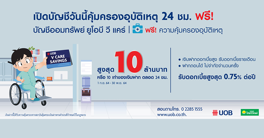 เปิดบัญชีออมทรัพย์ ยูโอบี วีแคร์ รับดอกเบี้ยสูง พร้อมรับความคุ้มครองอุบัติเหตุสูงสุด 10 ล้านบาท*