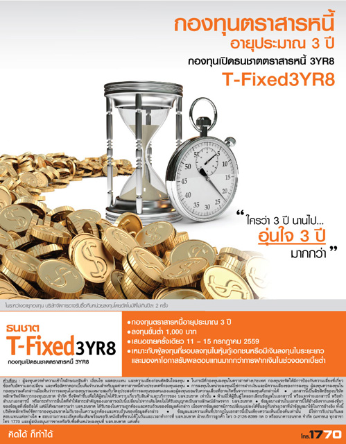 กองทุนเปิดธนชาตตราสารหนี้ T-Fixed3YR8 อายุประมาณ 3 ปี สร้างโอกาสรับผลตอบแทนมากกว่าการฝากเงินในช่วงดอกเบี้ยต่ำ ลงทุนขั้นต่ำ 1,000 บาท เสนอขายเพียงครั้งเดียว จนถึง 15 ก.ค. 59 นี้