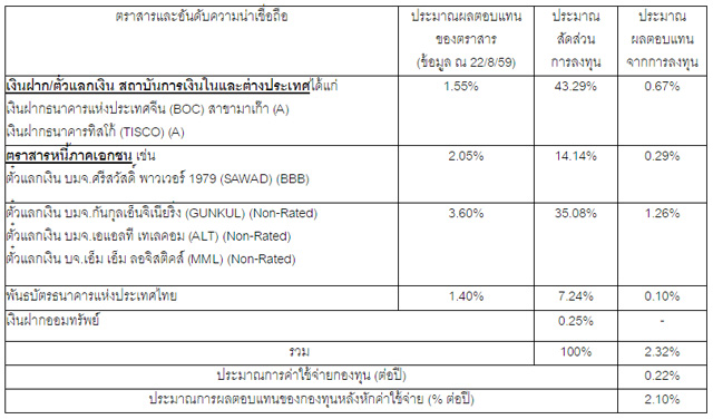 - ตราสารที่ลงทุน สัดส่วนการลงทุน หรือประมาณการอัตราผลตอบแทนดังกล่าว อาจมีการเปลี่ยนแปลงได้ หากสภาวะตลาดมีการเปลี่ยนแปลงไป หรือในกรณีที่ไม่สามารถหาตราสารที่จะลงทุนตามที่แจ้งไว้ได้ ซึ่งทำให้ผู้ถือหน่วยลงทุนอาจไม่ได้รับผลตอบแทนตามอัตราที่ประมาณการไว้ ทั้งนี้บริษัทจัดการอาจจะพิจารณาลงทุนในตราสารหนี้อื่นๆ ที่มีอันดับความน่าเชื่อถือ (Credit Rating) อยู่ในระดับการลงทุน (Investment Grade) เพื่อประโยชน์ของผู้ถือหน่วยลงทุน