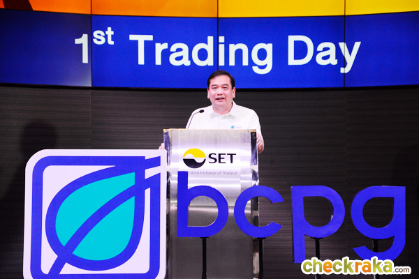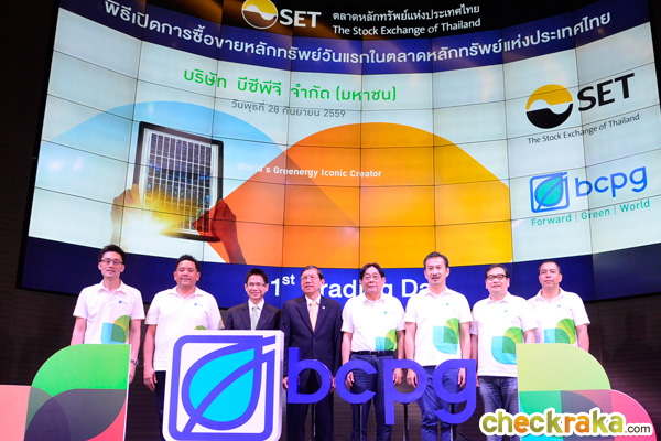 ดร. สันติ กีระนันท์ รองผู้จัดการ หัวหน้าสายงานผู้ออกหลักทรัพย์ ตลาดหลักทรัพย์แห่งประเทศไทย กล่าวแสดงความยินดี ที่บมจ.บีซีพีจี (BCPG) ได้เข้าสู่ตลาดหลักทรัพย์และเปิดการซื้อขายหุ้นวันนี้ (28 ก.ย. 59) เป็นวันแรก แล้วกล่าวต่อว่า BCPG เป็นบริษัทในเครือของกลุ่ม บมจ.บางจากปิโตรเลียม ที่เกิดจากการปรับโครงสร้างกลุ่มธุรกิจไฟฟ้าพลังงานหมุนเวียน เพื่อรองรับการขยายธุรกิจไฟฟ้าพลังงานหมุนเวียนในอนาคตของกลุ่ม บมจ.บางจากปิโตรเลียม ซึ่งนับเป็นทางเลือกที่น่าสนใจสำหรับผู้ที่ต้องการลงทุนในกลุ่มพลังงาน