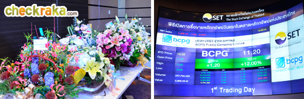 กระเช้าดอกไม้ที่ส่งมาร่วมแสดงความยินดี และกระดานหลักทรัพย์ BCPG