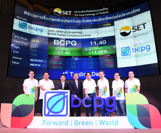 นายบัณฑิต สะเพียรชัย กรรมการผู้จัดการใหญ่ บริษัท บีซีพีจี จำกัด (มหาชน) หรือ BCPG ผู้ผลิตและจำหน่ายไฟฟ้าจากพลังงานหมุนเวียน เปิดเผยว่า บริษัทฯ ได้นำหุ้นเข้าจดทะเบียนและทำการซื้อขายในตลาดหลักทรัพย์แห่งประเทศไทยเป็นวันแรกในวันที่ 28 กันยายน 2559 นี้ โดยใช้ชื่อย่อหุ้น "BCPG" ในการซื้อขายในกระดานหลักทรัพย์ฯ ซึ่งได้รับการตอบรับจากนักลงทุนเป็นอย่างดี หลังก่อนหน้านี้บริษัทฯ ได้เสนอขายหุ้นสามัญเพิ่มทุน (IPO) จำนวน 590 ล้านหุ้น มูลค่าตราไว้ (พาร์) 5 บาท ให้กับผู้ถือหุ้นเดิมของ BCP เฉพาะกลุ่มที่มีสิทธิได้รับการจัดสรรหุ้นเมื่อวันที่ 14 - 16 กันยายนที่ผ่านมา และบุคคลทั่วไป นักลงทุนสถาบันรวมถึงผู้มีอุปการคุณของบริษัทฯ เมื่อวันที่ 16, 19 และ 20 กันยายนที่ผ่านมา ในราคาหุ้นละ 10 บาท