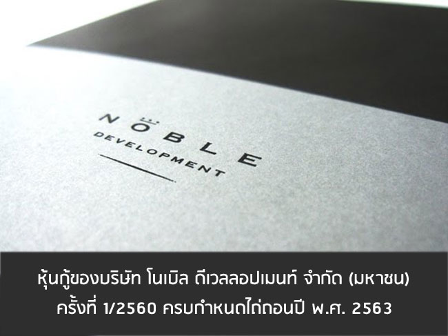 บริษัท โนเบิล ดีเวลลอปเมน จำกัด (มหาชน) เสนอขายหุ้นกู้ชนิดระบุชื่อผู้ถือ ประเภทไม่ด้อยสิทธิ ไม่มีประกัน และมีผู้แทนผู้ถือหุ้นกู้ และผู้ออกหุ้นกู้มีสิทธิไถ่ถอนหุ้นกู้ก่อนครบกำหนดในนาม "หุ้นกู้ของบริษัท โนเบิล ดีเวลลอปเมนท์ จำกัด (มหาชน) ครั้งที่ 1/2560 ครบกำหนดไถ่ถอนปี พ.ศ. 2563"