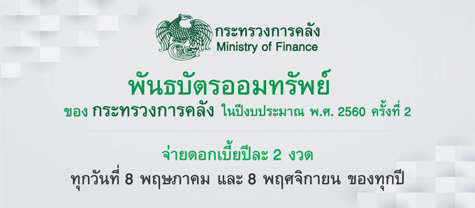 พันธบัตรออมทรัพย์ของกระทรวงการคลัง ในปีงบประมาณ พ.ศ. 2560 ครั้งที่ 2 เปิดขายถึง 31 ส.ค. 2560