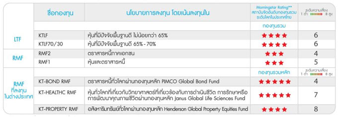 การป้องกันความเสี่ยงจากอัตราแลกเปลี่ยนในรูปสกุลเงินบาท ตามดุลยพินิจของผู้จัดการกองทุน : KT-BOND RMF, KT-HEALTHC RMF, KT-PROPERTY RMF (ข้อมูล Morningstar ณ วันที่ 30 เม.ย. 60 / ผลการดำเนินงานในอดีต มิได้เป็นสิ่งยืนยันถึงผลการดำเนินงานในอนาคต ปัจจัยความเสี่ยงที่สำคัญ เช่น ความเสี่ยงจากความผันผวนของราคาหลักทรัพย์ / ความเสี่ยงในเรื่องอัตราแลกเปลี่ยน / ความเสี่ยงของประเทศที่ลงทุน