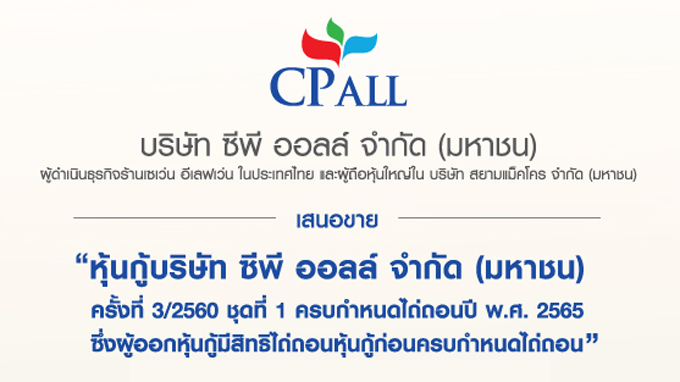 หุ้นกู้บริษัท ซีพี ออลล์ จำกัด (มหาชน) ครั้งที่ 3/2560 ชุดที่ 1 ครบกำหนดไถ่ถอนปี พ.ศ. 2565