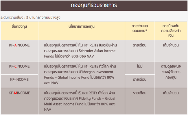 KF-AINCOME, KF-CINCOME, KF-INCOME อาจลงทุนในหรือมีไว้ซึ่งตราสารหนี้ที่มีอันดับความน่าเชื่อถือต่ำกว่าอันดับที่สามารถลงทุนได้ (Non-investment grade) หรือที่ไม่ได้รับการจัดอันดับความน่าเชื่อถือ (Unrated Bond) ผู้ลงทุนอาจมีความเสี่ยงจากการผิดนัดชำระหนี้ของผู้ออกตราสาร ซึ่งส่งผลให้ผู้ลงทุนขาดทุนจากการลงทุนบางส่วน หรือทั้งจำนวนได้ และในการขายคืนหน่วยลงทุนอาจไม่ได้รับเงินคืนตามที่ระบุไว้ในโครงการ ผลการดำเนินงานในอดีตของกองทุนรวมมิได้เป็นสิ่งยืนยันถึงผลการดำเนินงานในอนาคต