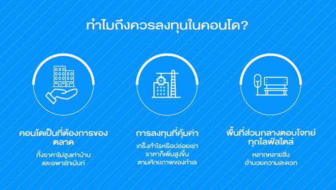 การลงทุนในคอนโดมอบผลตอบแทนเป็นกอบเป็นกำได้ไม่ยาก ทั้งในระยะสั้น และระยะยาว ไม่ว่าจะปล่อยเช่า หรือเก็งกำไรจากการขายต่อ ทำเลที่ตั้งของคอนโดเป็นตัวแปรสำคัญของผลตอบแทน จึงควรเลือกคอนโดที่ตั้งอยู่บนทำเลศักยภาพที่มีโอกาสเติบโตในระยะยาว และดึงดูดผู้คนเข้ามาอยู่อาศัยในพื้นที่อย่างต่อเนื่อง