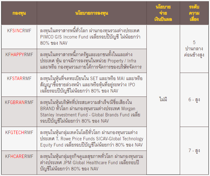 - KFGTECHRMF และ KFHCARERMF ลงทุนกระจุกตัวในหมวดอุตสาหกรรม จึงมีความเสี่ยงที่ผู้ลงทุนอาจสูญเสียเงินลงทุนจำนวนมาก ผู้ลงทุนควรขอคำแนะนำเพิ่มเติมก่อนทำการลงทุน