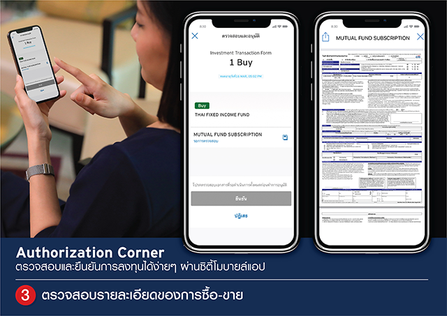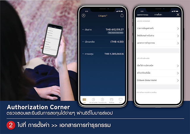 ธนาคารซิตี้แบงก์ ประเทศไทย เปิดตัว "ออเธอไรเซชั่น คอร์เนอร์" (Authorization Corner) ฟีเจอร์ใหม่ล่าสุดบนแอปพลิเคชัน ที่รวบรวมเอกสารออนไลน์ของทุกการทำธุรกรรมกับธนาคารฯ ไว้ในที่เดียว โดยเริ่มต้นใช้งานในการยืนยันเอกสารคำสั่งซื้อขายหน่วยลงทุน ให้ทุกการลงทุนสะดวกรวดเร็ว และปลอดภัย ตอบโจทย์การใช้งานดิจิทัลไลฟ์สไตล์สำหรับคนยุคใหม่มากยิ่งขึ้น โดยลูกค้าไม่จำเป็นต้องเดินทางมาที่สาขาเพียงเพื่อรอเซ็นเอกสาร สามารถใช้เวลาเพียงประมาณ 5 - 10 นาที ในการทำธุรกรรม ได้ง่ายๆ ใน 4 ขั้นตอน ดังนี้