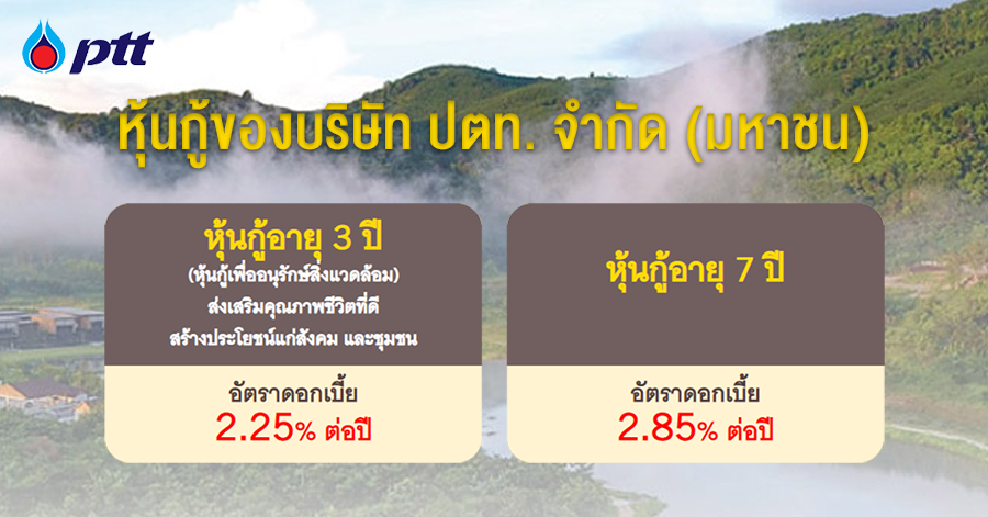 หุ้นกู้มีอายุ 3 ปี (หุ้นกู้เพื่ออนุรักษ์สิ่งแวดล้อม) มีอัตราดอกเบี้ยร้อยละ 2.25 ต่อปี และหุ้นกู้อายุ 7 ปี มีอัตราดอกเบี้ยร้อยละ 2.85 ต่อปี ชำระดอกเบี้ยทุกๆ 6 เดือน ตลอดอายุหุ้นกู้ มูลค่าที่ตราไว้หน่วยละ 1,000 บาท จองซื้อขั้นต่ำ 100,000 บาท ภายใต้โครงการหุ้นกู้ของบริษัท ปตท. จำกัด (มหาชน) ปี พ.ศ. 2563 วงเงิน 44,000,000,000 บาท ("โครงการหุ้นกู้") โดยเสนอขายให้แก่ผู้ลงทุนทั่วไป หรือแก่ผู้ลงทุนสถาบัน และ/หรือ ผู้ลงทุนรายใหญ่