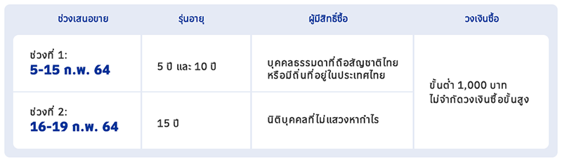 - ช่วงที่ 2 เสนอขาย 16-19 ก.พ. 64 (หรือจนกว่าจะเต็มวงเงินจัดจำหน่าย) ที่ธนาคารกรุงเทพทุกสาขา