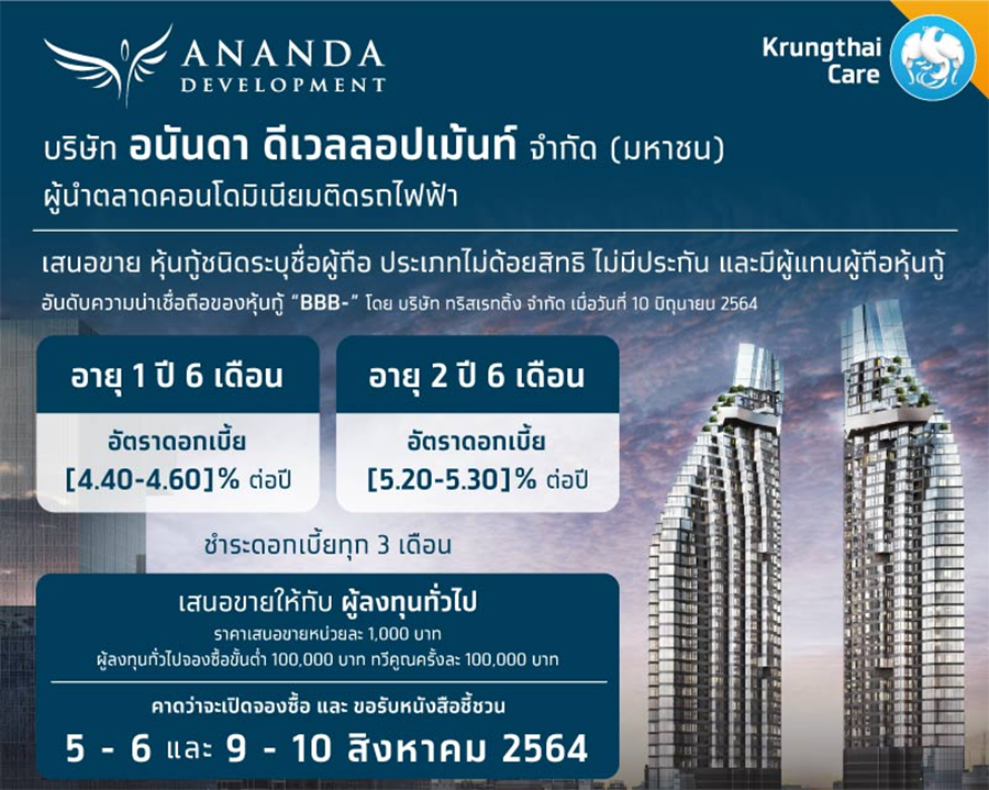 บริษัท อนันดา ดีเวลลอปเม้นท์ จำกัด (มหาชน) ผู้นำตลาดคอนโดมิเนียมติดรถไฟฟ้า เสนอขายหุ้นกู้ชนิดระบุชื่อผู้ถือ ประเภทไม่ด้อยสิทธิ ไม่มีประกัน และมีผู้แทนผู้ถือหุ้นกู้