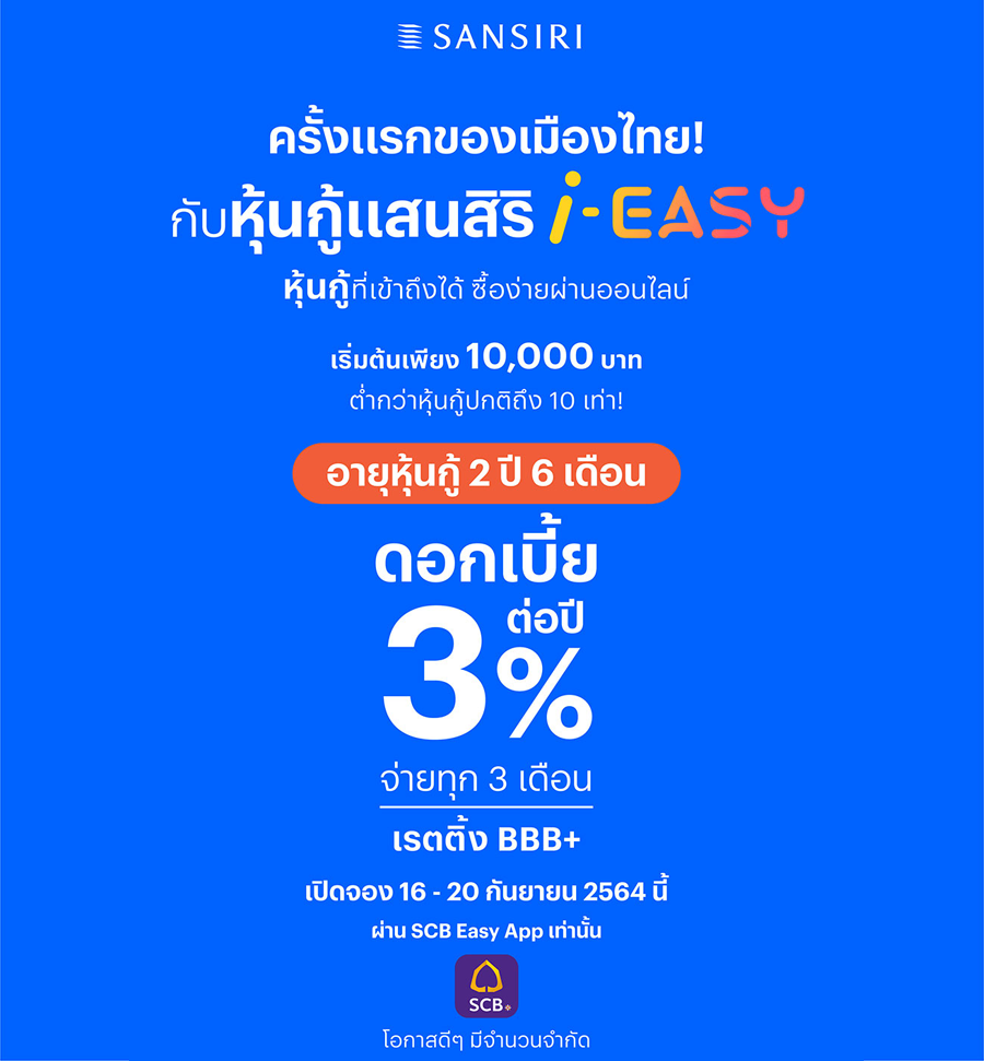 สามารถศึกษารายละเอียดเพิ่มเติมได้ที่ www.sansiri.com/thai/หุ้นกู้แสนสิริ/i-easy