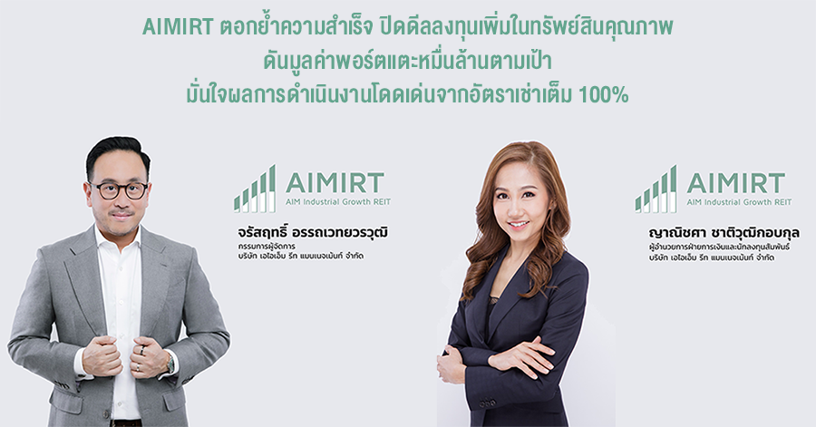 AIMIRT ตอกย้ำความสำเร็จ ปิดดีลลงทุนเพิ่มในทรัพย์สินคุณภาพ ดันมูลค่าพอร์ตแตะหมื่นล้านตามเป้า มั่นใจผลการดำเนินงานโดดเด่นจากอัตราเช่าเต็ม 100%