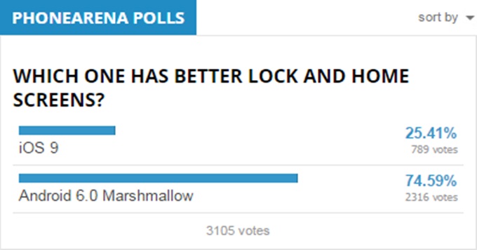 ในส่วนของหน้าจอ Lock screen และ Home screen ของทั้ง 2 ระบบ ดูเหมือนว่าคะแนนโหวตทางฝั่งของ Android นั้นจะมากกว่า iOS 9 ประมาณ 3 ต่อ 1 เลยทีเดียว อาจเป็นเพราะว่าระบบ Android นั้นสามารถเพิ่มลูกเล่นให้กับหน้าจอได้มากกว่า iOS นั่นเองจึงทำให้ได้คะแนนนำไป