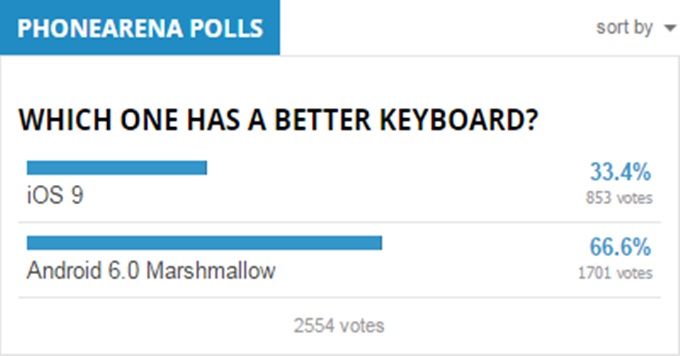 ในส่วนของการใช้งาน Keyboard หรือแป้นพิมพ์ 1,701 คะแนนโหวตก็ตกเป็นของ Android เหมือนเดิม ในขณะที่ iOS นั้นได้คะแนนโหวต 856 คะแนน