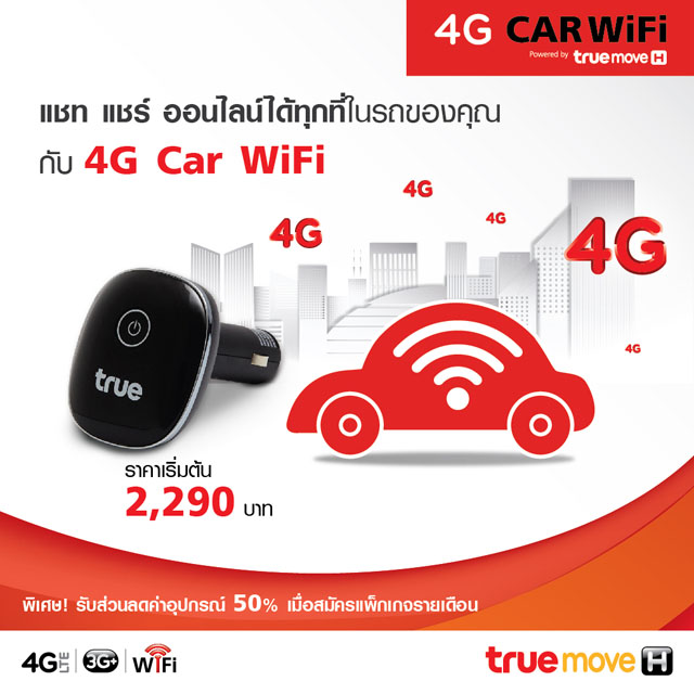 ทรูมูฟ เอช ผู้นำเครือข่าย 4G ที่ใช้ได้จริง 77 จังหวัดทั่วไทย ต่อยอดประสบการณ์ 4G ทุกที่ทุกเวลา เปิดตัวนวัตกรรมล่าสุด "4G Car WiFi" อุปกรณ์ที่เปลี่ยนสัญญาณ 4G ให้เป็น WiFi ในรถ สามารถเชื่อมต่อการใช้งานอินเทอร์เน็ตได้สูงสุดถึง 10 อุปกรณ์พร้อมๆ กัน ตอบโจทย์ไลฟ์สไตล์คนรุ่นใหม่ที่ต้องการเชื่อมต่อโลกออนไลน์ตลอดเวลาที่อยู่บนรถ มีถึง 2 รุ่น รุ่นเชื่อมต่อได้สูงสุด 5 อุปกรณ์ ราคา 2,290 บาท และรุ่นเชื่อมต่อได้สูงสุด 10 อุปกรณ์ ในราคาเพียง 2,790 บาท