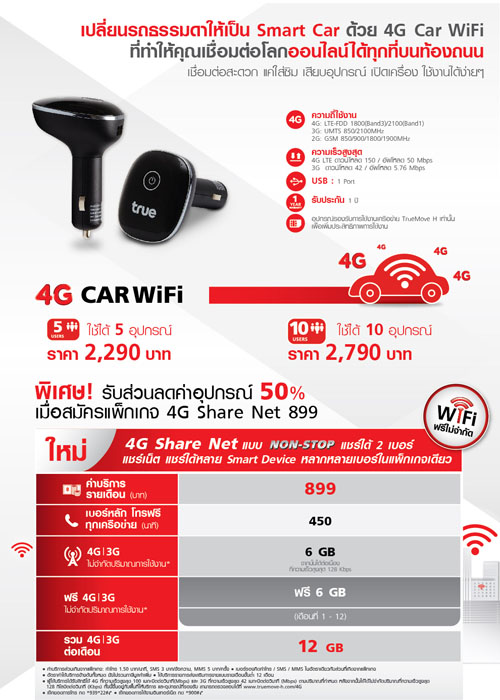 พิเศษ! รับส่วนลดค่าอุปกรณ์ 4G Car WiFi 50% เมื่อสมัครแพ็กเกจ 4G iNet 799 บาทขึ้นไป หรือพิเศษแพ็กเกจ 4G Share Net ที่ให้แชร์เน็ตได้กับหลากหลาย Smart Device หลายเบอร์ในแพ็กเกจเดียว เริ่มต้น 899 บาทต่อเดือน สามารถแชร์ได้ 2 เบอร์ พร้อมรับเน็ตสูงสุด 20 GB ต่อเดือน ตั้งแต่วันนี้ - 31 มกราคม 2559