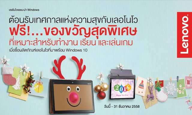 เลอโนโว ต้อนรับเทศกาลแห่งความสุขที่ใกล้จะมาถึงด้วยโปรโมชั่นสุดพิเศษสำหรับคนทำงาน, นักเรียน, นักศึกษา และเกมเมอร์ เพียงซื้อผลิตภัณฑ์เลอโนโวที่มาพร้อม Windows 10 เช่น แท็บเล็ต หรือแล็ปท็อป ท่านก็สามารถรับสิทธ์ใช้บริการแอปพลิเคชั่นชื่อดังอย่าง Dropbox, Coolgames.com และ Oneplay ฟรี! โดยท่านสามารถลงทะเบียนรับสิทธิ์ได้ตั้งวันนี้ - 31 ธันวาคม 2558