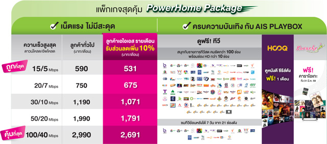 เอไอเอส ไฟเบอร์ อินเทอร์เน็ตความเร็วสูง รายแรกและรายเดียวที่ให้บริการ PURE Fibre อย่างเต็มรูปแบบ เดินหน้าส่ง แพ็กเกจรายเดือนใหม่ที่ดีที่สุดในตลาด "PowerHome package" ด้วยราคาเริ่มต้นถูกที่สุด เพียง 590 บาท/เดือน บนความเร็วดาวน์โหลด/อัพโหลด 15/5 Mbps ทั้งสำหรับบ้านและคอนโด ฟรีค่าติดตั้ง พร้อมทั้งอัพเกรดฟีเจอร์ใหม่ให้ตอบโจทย์การใช้งานของคอเน็ตได้หลากหลายยิ่งขึ้น ได้แก่ Port forward สำหรับดูกล้อง CCTV จากนอกบ้าน, Bridge Mode ให้ลูกค้าสามารถเปลี่ยน Router เป็นรุ่นที่ต้องการได้ ทั้งนี้ ลูกค้าเอไอเอส ไฟเบอร์ปัจจุบันสามารถขอเปลี่ยนมาเป็นแพ็กเกจ PowerHome ได้ตั้งแต่เดือนเมษายนเป็นต้นไป