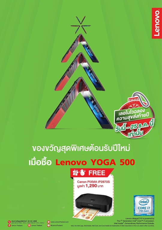 ช่วงนี้เป็นช่วงเทศกาลส่งท้ายปีพอดี Lenovo ไม่พลาดที่จะจัดโปรโมชั่นฉลองความสุขส่งท้ายปีให้กับสาวก Lenovo โดยเฉพาะ เมื่อซื้อ Lenovo Yoga 500 รับฟรีทันที! Canon PIXMA iP2870s มูลค่า 1,290 บาท ระยะเวลาวันนี้ - 25 ธันวาคมนี้เท่านั้น