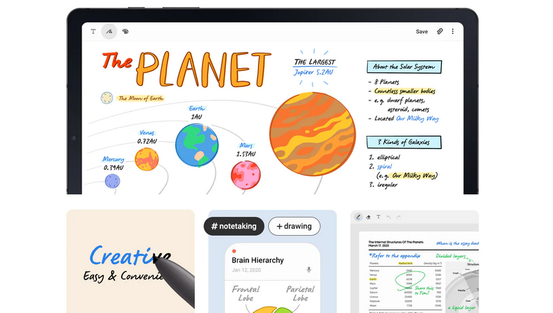 และแน่นอนครับว่าพระเอกคือ S Pen มีการดีไซน์ใหม่ จับถนัดมือมากขึ้น เขียนลื่น รองรับแรงกด 4,096 ระดับ และตอบสนองใวกว่าคู่แข่งในตอนนี้ และมาพร้อมฟีเจอร์การใช้งานครบถ้วนเหมือนรุ่นใหญ่เลยครับ จดบันทึกแล้วซูมดูได้ถึง 300% สามารถเปลี่ยนจากลายมือ เป็นข้อความได้อย่างชาญฉลาด และแม่นยำ รองรับการบันทึกไฟล์หลากหลายสกุล เพื่อนำไปใช้งานต่อได้อย่างสะดวก และยืดหยุ่น สามารถเขียนข้อความบน PDF ได้เลย ทำให้ทั้งเรื่องงาน และเรื่องเรียน หรือแม้แต่ศิลปะ ล้วนลงตัวบน Tablet รุ่นนี้ และ S Pen สามารถดูดติดกับขอบตัวเครื่องได้ ป้องกันการหล่นหาย