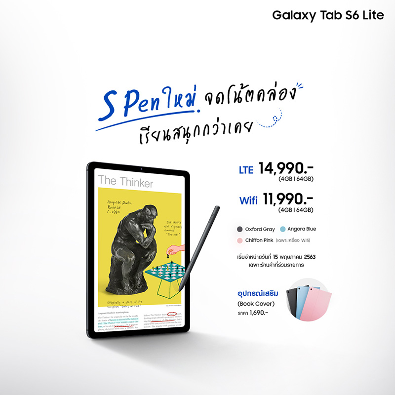 Galaxy Tab S6 Lite วางจำหน่ายอย่างเป็นทางการแล้ววันนี้ ในราคาเริ่มต้นเพียง 11,990 บาท สำหรับรุ่น Wi-Fi และ 14,990 บาท สำหรับรุ่น LTE นอกจากนี้ยังมีอุปกรณ์เสริมอย่างเคส Book Cover มาพร้อมที่เก็บ S Pen สามารถปรับมุมมองได้ 3 ระดับในราคา 1,690 บาท ที่ Samsung Experience Store และ Samsung.com ผู้ที่สนใจสามารถดูรายละเอียดเพิ่มเติมและสั่งซื้อได้ที่