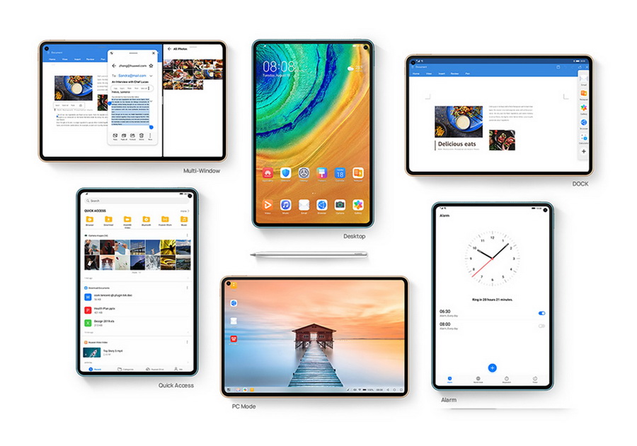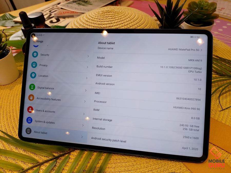 Huawei MatePad Pro 5G มาพร้อมดีไซน์เดิม แต่ฝาหลังเปลี่ยนใช้วัสดุหนัง Vegan Leather ตัวเครื่องมีความบาง 7.2 มม. และมีน้ำหนักเพียง 460 กรัม วัสดุเป็นกระจก และโลหะ หน้าจอ IPS ขนาด 10.8 นิ้ว ความละเอียด 2560 x 1600 pixels (280 ppi) อัตราส่วน 16:10, ทำงานบน Android 10 ครอบทับด้วย EMUI 10, Kirin 990 5G, GPU Mali-G76 MP16, RAM 8GB, ROM 256GB รองรับ Nano Memory, ลำโพง 4 ตัว จูนเสียงโดย Harman Kardon, Wi-Fi 802.11 a/b/g/n/ac, Bluetooth 5.1, GPS, USB Type-C 3.1, แบตเตอรี่ความจุ 7250 mAh รองรับชาร์จเร็ว Fast charging 40W, Fast wireless charging 27W และ Reverse wireless charging 7.5W, กล้องหน้าความละเอียด 8MP F2.0 และกล้องหลังความละเอียด 13MP F1.8, PDAF รองรับบันทึกวีดีโอ 4K 30FPS