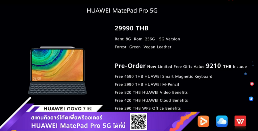 Huawei MatePad Pro 5G ราคา 29,990 บาท ราคาค่อนข้างโดดจากรุ่น 4G LTE พอสมควรเลยครับ แต่ก็ได้เรื่อง 5G และ RAM/ROM ที่มากขึ้นด้วยนะครับ รองรับ Fast wireless charging 27W เพิ่มขึ้นมาด้วย (เร็วกว่ารุ่น 4G) และถ้าสั่งจองล่วงหน้าจะได้รับของแถมมูลค่ารวมสูงถึง 9,210 บาท ใครที่สนใจไปจัดกันได้นะครับ ตัวเครื่องสวยมากๆทีเดียวครับ