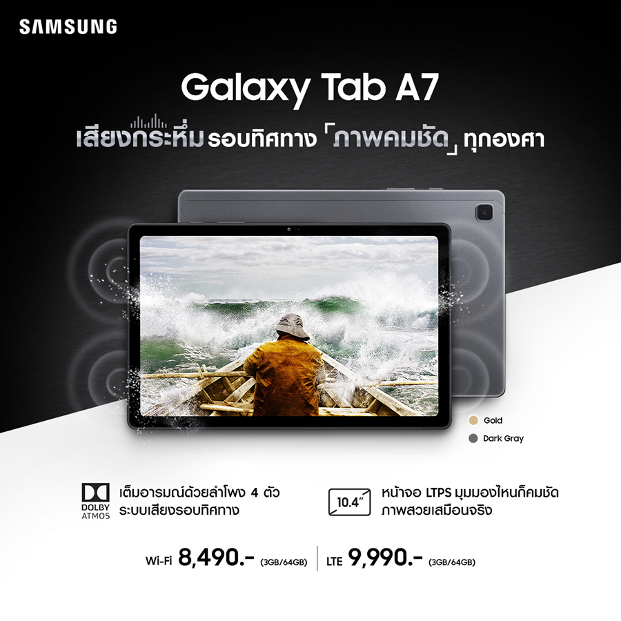 - Galaxy Tab A7 รุ่น Wi-Fi (RAM 3GB / ROM 64GB) วางจำหน่ายในราคา 8,490 บาท
