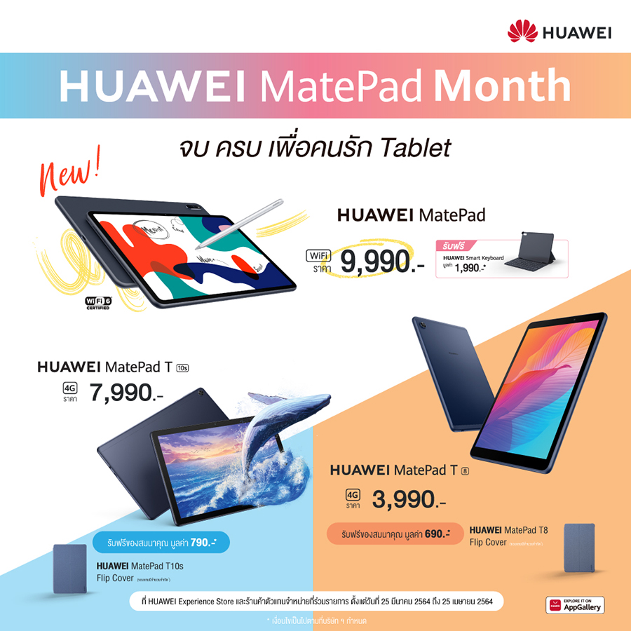 หากอยากได้แท็บเล็ตที่เรียนแล้ว fun ทั้งยัง fab(bulous) ไปกับความบันเทิงแบบจัดเต็ม ทางหัวเว่ยได้จัดโปรโมชันสุดร้อนแรงรับซัมเมอร์นี้ด้วยแท็บเล็ต 3 รุ่น 3 สไตล์ ในราคาสุดคุ้มเพื่อหลากหลายการใช้งานพร้อมแจกของสมนาคุณเด็ดๆ เพียบ ตั้งแต่ 25 มีนาคม – 25 เมษายน 2564 โดยเมื่อซื้อ HUAWEI MatePad ในราคา 9,990 บาท รับไปเลย HUAWEI Smart Keyboard มูลค่า 1,990 บาท ด้าน HUAWEI MatePad T 10s มาในราคา 7,990 บาท พร้อมรับเคสแท็บเล็ต HUAWEI MatePad T 10s Flip Cover ไปใช้คู่กันทันที มูลค่า 790 บาท ส่วน HUAWEI MatePad T 8 เหลือเพียง 3,990 บาท พร้อมรับฟรีทันที HUAWEI MatePad T 8 Flip Cover มูลค่า 690 บาท รีบมาจับจองเป็นเจ้าของกันได้แล้วที่ HUAWEI Experience Store และร้านค้าตัวแทนจำหน่ายอย่างเป็นทางการทั่วประเทศ