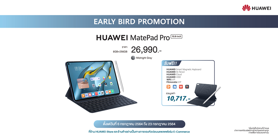 ในราคา 26,990 บาท และเมื่อซื้อสินค้าตั้งแต่วันที่ 6 - 23 กรกฎาคม 2564 รับไปให้หนำใจกับ HUAWEI Smart Magnetic Keyboard, HUAWEI M-Pencil, HUAWEI Cloud (50GB ระยะเวลา 3 เดือน), HUAWEI VDO (ระยะเวลา 1 เดือน), WPS VIP (ระยะเวลา 3 เดือน) และ FilmoraGo VIP (ระยะเวลา 3 เดือน) มูลค่ารวม 10,717 บาท โดยสามารถสั่งซื้อผ่านช่องทางออนไลน์เท่านั้น