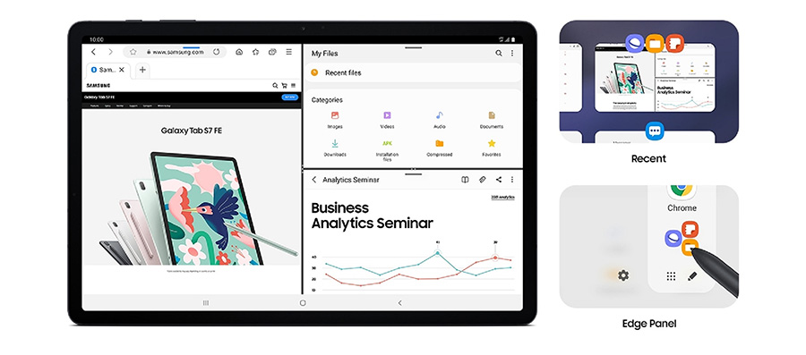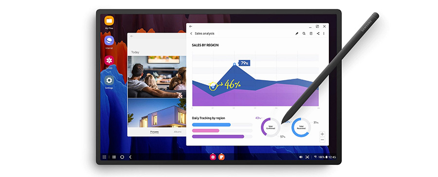จะเห็นได้ว่าแม้หลายคนจะมีแท็บเล็ตแล้วแต่ก็ยังต้องใช้คอมพิวเตอร์ร่วมกันอยู่ดี เพราะในบางครั้งการใช้งานคอมพิวเตอร์อาจจะคุ้นมือกว่า เช่น การพิมพ์รายงานจำนวนมาก การเปิด presentation สำหรับการประชุม แต่ Galaxy Tab S7 FE สามารถทำสิ่งเหล่านี้ได้ด้วยฟีเจอร์ Samsung DeX ที่เปลี่ยนแท็บเล็ตให้กลายเป็นคอมพิวเตอร์ PC ได้ โดยการปรับ interface ให้เป็นหน้าจอมอนิเตอร์เพื่อปรับรูปแบบในการใช้งาน และยังสามารถใช้งานร่วมกับ Keyboard Cover เพื่อให้พิมพ์งานต่างๆ ได้สะดวกขึ้นเหมือนกับมีคอมพิวเตอร์ PC อีกเครื่อง หรือจะเชื่อมต่อเพื่อสลับการทำงานจากแท็บเล็ตไปยังคอมพิวเตอร์ หรือคอมพิวเตอร์มายังแท็บเล็ต ก็ทำได้อย่างง่ายดาย พร้อมแชร์ข้อมูลกันได้ทันที