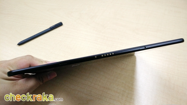 ด้านขวามีปุ่ม Power, ปุ่มปรับระดับเสียง, ไมโครโฟน, ช่องใส่ซิม ส่วนด้านซ้ายมีพอร์ทเชื่อมต่อ PIN สำหรับเชื่อมต่อกับอุปกรณ์เสริม Pogo Keyboard ซึ่งจะช่วยให้ Samsung Galaxy Tab S3 ของเราใช้งานแบบ Notebook ได้ (ราคา 3,390 บาท)