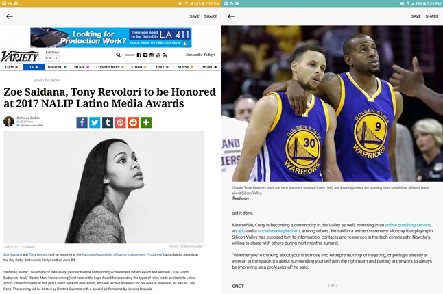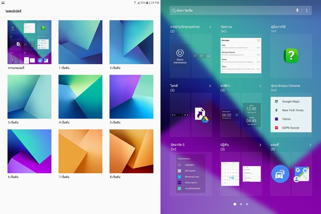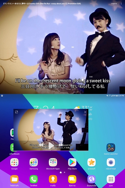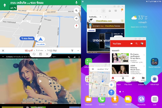 ฟังก์ชั่นจดบันทึก (แบบวาดภาพ) และแอปพลิเคชั่น SketchBook for Galaxy สำหรับแท็บเล็ต การใช้งาน Multi Window เป็นอะไรที่เหมาะมากๆ เพราะพื้นที่หน้าจอใหญ่ขนาดนี้ การใช้งานพร้อมกัน 2 แอปพลิเคชั่นนั้นจึงสะดวกและเหมาะสมมากๆ วิธีเปิดใช้งานเพียงแค่แตะค้างที่ปุ่ม Recent app หรือเปิดหน้า Recent app ขึ้นมาแล้วแตะที่เครื่องหมายสี่เหลี่ยมสองอัน (ใกล้กับปุ่มปิดแอปพลิเคชั่น) หรืออีกหนึ่งวิธี คือ ลากนิ้วในแนวทแยงจากมุมหน้าจอ เพื่อย่อหน้าต่างลงมาให้กลายเป็นหน้าต่างขนาดเล็ก จากการทดลองใช้ สามารถเปิดทิ้งไว้ได้หลายๆ หน้าต่างเลยครับ ตัวเครื่องไม่มีอาการหน่วงอะไรเลย นอกจากนี้ยังสามารถย่อหน้าต่างให้กลายเป็นไอคอนขนาดเล็กได้ด้วย