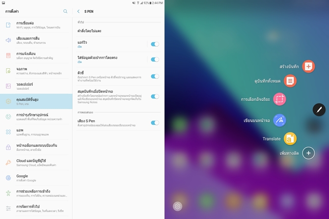 ฟังก์ชั่นปากกา S Pen ยังคงเหมือนเดิมทุกอย่างครับ มีคำสั่ง Air Command มาให้ใช้งานกันเหมือนเดิม เพียงเอามาจ่อใกล้ๆหน้าจอก็พร้อมใช้งานแล้วครับ สำหรับฟังก์ชั่นหลักๆ ได้แก่ สร้างบันทึก, ดูบันทึกทั้งหมด, การเลือกอัจฉริยะ, เขียนบนหน้าจอ, แปลภาษา และสามารถเพิ่มทางลัดอื่นๆ ได้อีก
