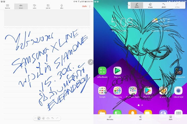 รูปแบบการจดบันทึกจะถูกรวมเป็นฟังก์ชั่นเดียวกันทั้งหมด ไม่ว่าจะเป็นการพิมพ์ การเขียนด้วยปากกา S Pen หรือการวาดรูป ความลื่นไหล และแม่นยำทำได้ยอดเยี่ยมมากครับ ให้ความรู้สึกที่ดีมาก คนที่ชอบจดบันทึกหรือวาดรูปเล่น หรือถึงขนาดจะสร้างสรรค์งานศิลปะ Samsung Galaxy Tab S3 สามารถตอบสนองได้อย่างแน่นอน ถ้ารู้สึกวาดไม่สะใจสามารถดาวน์โหลดแอปพลิเคชั่น SketchBook for Galaxy (แจกฟรีสำหรับลูกค้าเป็นตัวโปร) จะวาดได้สนุกยิ่งขึ้น