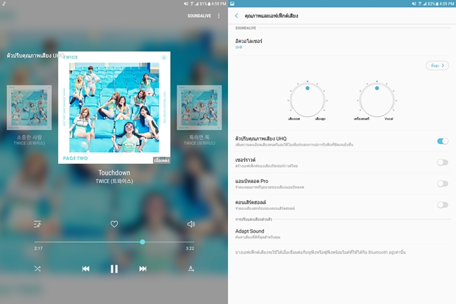Samsung Galaxy Tab S3 มาพร้อมฟังก์ชั่นปรับแต่งเสียง SoundAlive และ Adapt Sound ซึ่งสามารถปรับจูนเสียงได้ตามธรรมชาติของหูแต่ละคน ทำให้ได้เสียงที่เหมาะสมที่สุด เป็นแท็บเล็ตที่เสียงดีมากครับ ทั้งผ่านทางลำโพงและทางหูฟัง รับประกันโดย AKG เลยละครับ
