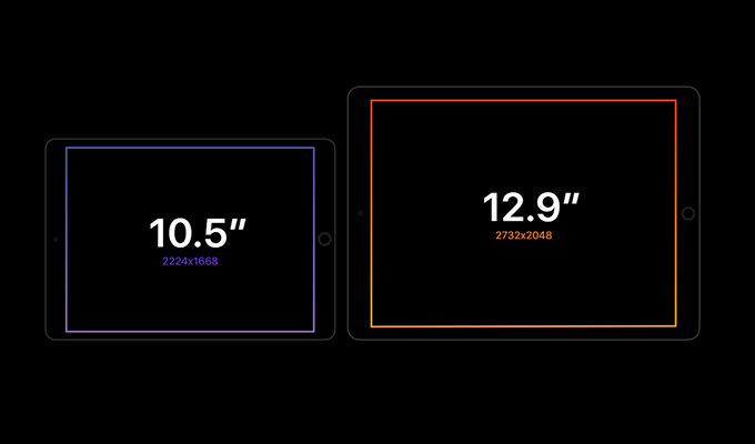 iPad Pro ทั้งสองรุ่นจะมีขนาดหน้าจอแสดงผลที่ต่างกันไปตามรุ่น คือ ขนาด 10.5 นิ้ว ความละเอียด 2224x1668 พิกเซล และ ขนาด 12.9 นิ้ว ความละเอียด 2732 x 2048 พิกเซล