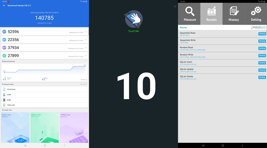 Samsung Galaxy Tab S6 Lite มาพร้อม หน้าจอ IPS ขนาด 10.4 นิ้ว ความละเอียด 1200 x 2000 pixels (224 ppi) อัตราส่วน 5:3 ขอบหน้าจอบางเพียง 9 มม., ทำงานบน Android 10 ครอบทับด้วย One UI 2.1, ชิปเซ็ต Exynos 9611, RAM 4GB, ROM 128GB (รองรับ MicroSD สูงสุด 1TB) กับคะแนนทดสอบ ผลออกมาตามนี้ครับ